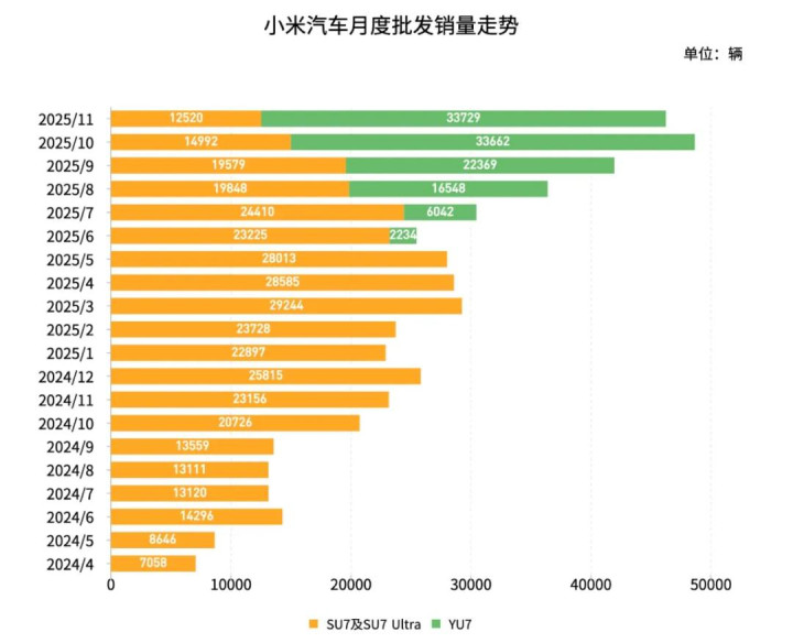 具体的数据,大家可以看下下面这张图,这是小米自去年4月份以来,SU7、YU7的交付情况,可以看到不管是SU7、还是YU7,一旦开启交付,那速度是真的吓人。
